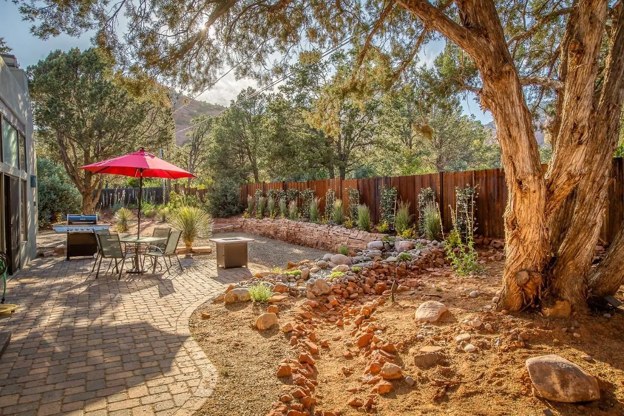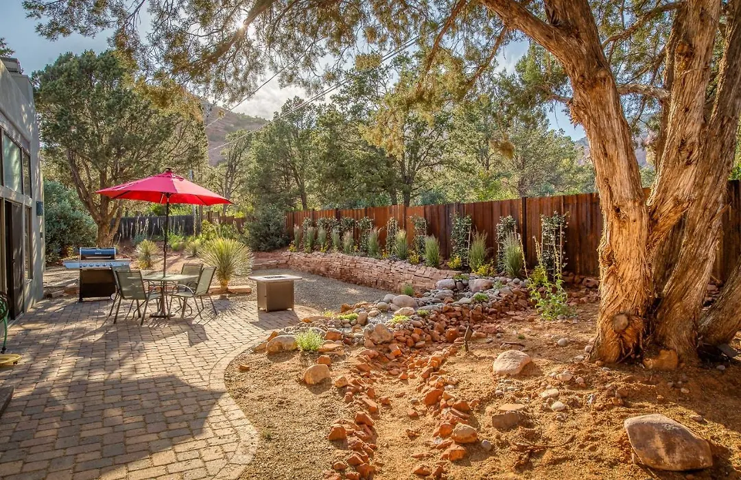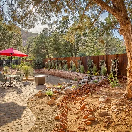 Von der Villa in Sedona aus können Sie einen Ausblick auf den Garten genießen. Diese Unterkunft verfügt über ein Badezimmer mit einer Waschmaschine. Außerdem gibt es einen Haartrockner und Badelaken.